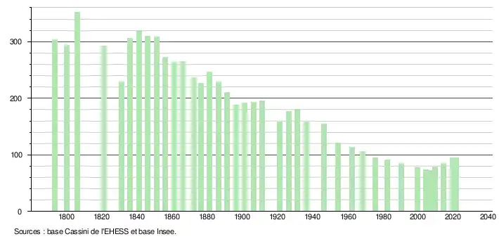 | L'évolution du nombre d'habitants est connue à travers les recensements de la population effectués dans la commune depuis 1793. Pour les communes de moins de 10 000 habitants, une enquête de recensement portant sur toute la population est réalisée tous les cinq ans, les populations légales des années intermédiaires étant quant à elles estimées par interpolation ou extrapolation[24]. Pour la commune, le premier recensement exhaustif entrant dans le cadre du nouveau dispositif a été réalisé en 2004[25]. En 2021, la commune comptait 95 habitants[Note 2], en augmentation de 9,2 % par rapport à 2015 (Aude : +2,47 %, France hors Mayotte : +1,84 %). |