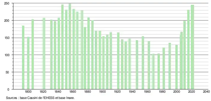 L'évolution du nombre d'habitants est connue à travers les recensements de la population effectués dans la commune depuis 1793. Pour les communes de moins de 10 000 habitants, une enquête de recensement portant sur toute la population est réalisée tous les cinq ans, les populations légales des années intermédiaires étant quant à elles estimées par interpolation ou extrapolation[17]. Pour la commune, le premier recensement exhaustif entrant dans le cadre du nouveau dispositif a été réalisé en 2005[18].