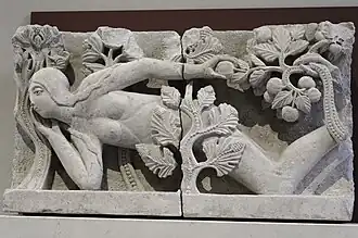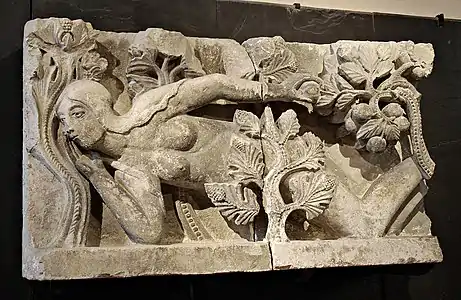 Le bas-relief, aujourd'hui incomplet, illustre une scène issue de la Genèse. Il représente Ève couchée, le corps ondulant dans une posture sensuelle, juste au moment qui précède la consommation du péché originel.