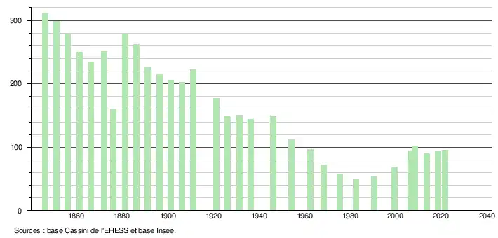 L'évolution du nombre d'habitants est connue à travers les recensements de la population effectués dans la commune depuis 1846. Pour les communes de moins de 10 000 habitants, une enquête de recensement portant sur toute la population est réalisée tous les cinq ans, les populations légales des années intermédiaires étant quant à elles estimées par interpolation ou extrapolation[25]. Pour la commune, le premier recensement exhaustif entrant dans le cadre du nouveau dispositif a été réalisé en 2008[26].