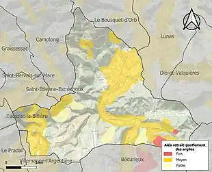 Le retrait-gonflement des sols argileux est susceptible d'engendrer des dommages importants aux bâtiments en cas d’alternance de périodes de sécheresse et de pluie. 33,6 % de la superficie communale est en aléa moyen ou fort (59,3 % au niveau départemental et 48,5 % au niveau national). Sur les 808 bâtiments dénombrés sur la commune en 2019, 570 sont en aléa moyen ou fort, soit 71 %, à comparer aux 85 % au niveau départemental et 54 % au niveau national. Une cartographie de l'exposition du territoire national au retrait gonflement des sols argileux est disponible sur le site du BRGM[27],[Carte 2].