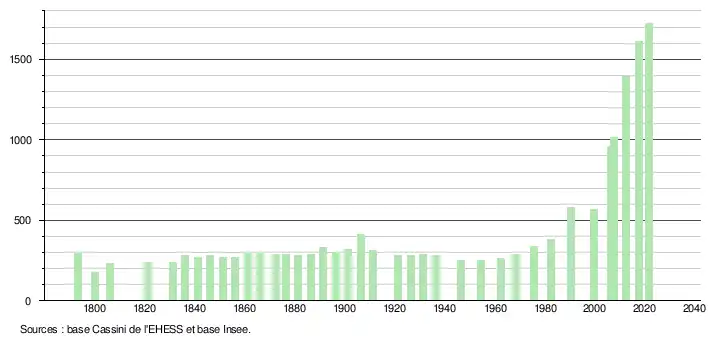 L'évolution du nombre d'habitants est connue à travers les recensements de la population effectués dans la commune depuis 1793. Pour les communes de moins de 10 000 habitants, une enquête de recensement portant sur toute la population est réalisée tous les cinq ans, les populations légales des années intermédiaires étant quant à elles estimées par interpolation ou extrapolation[15]. Pour la commune, le premier recensement exhaustif entrant dans le cadre du nouveau dispositif a été réalisé en 2007[16].