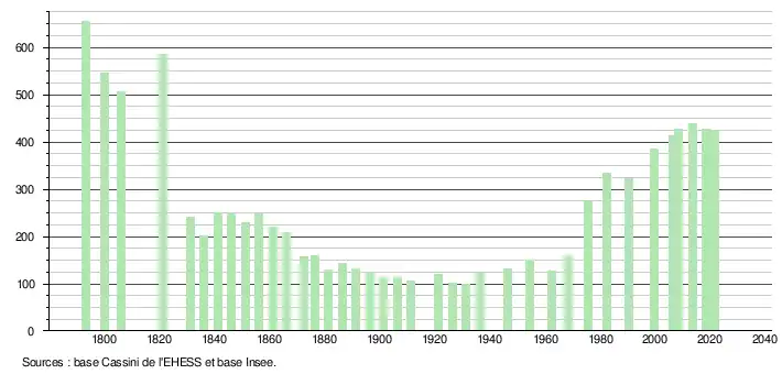 L'évolution du nombre d'habitants est connue à travers les recensements de la population effectués dans la commune depuis 1793. Pour les communes de moins de 10 000 habitants, une enquête de recensement portant sur toute la population est réalisée tous les cinq ans, les populations légales des années intermédiaires étant quant à elles estimées par interpolation ou extrapolation[33]. Pour la commune, le premier recensement exhaustif entrant dans le cadre du nouveau dispositif a été réalisé en 2008[34].