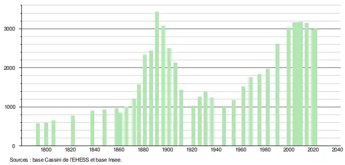 L'évolution du nombre d'habitants est connue à travers les recensements de la population effectués dans la commune depuis 1793. Pour les communes de moins de 10 000 habitants, une enquête de recensement portant sur toute la population est réalisée tous les cinq ans, les populations légales des années intermédiaires étant quant à elles estimées par interpolation ou extrapolation[46]. Pour la commune, le premier recensement exhaustif entrant dans le cadre du nouveau dispositif a été réalisé en 2004[47].
