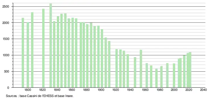 L'évolution du nombre d'habitants est connue à travers les recensements de la population effectués dans la commune depuis 1793. Pour les communes de moins de 10 000 habitants, une enquête de recensement portant sur toute la population est réalisée tous les cinq ans, les populations légales des années intermédiaires étant quant à elles estimées par interpolation ou extrapolation[18]. Pour la commune, le premier recensement exhaustif entrant dans le cadre du nouveau dispositif a été réalisé en 2008[19].
