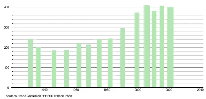L'évolution du nombre d'habitants est connue à travers les recensements de la population effectués dans la commune depuis 1931. Pour les communes de moins de 10 000 habitants, une enquête de recensement portant sur toute la population est réalisée tous les cinq ans, les populations légales des années intermédiaires étant quant à elles estimées par interpolation ou extrapolation[29]. Pour la commune, le premier recensement exhaustif entrant dans le cadre du nouveau dispositif a été réalisé en 2005[30].