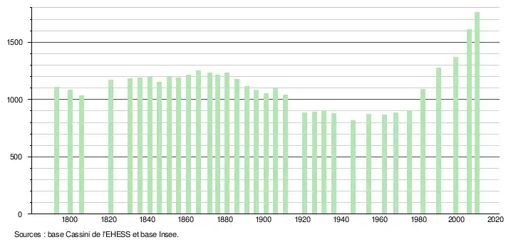 L'évolution du nombre d'habitants est connue à travers les recensements de la population effectués dans la commune depuis 1793. À partir du , les populations légales des communes sont publiées annuellement dans le cadre d'un recensement qui repose désormais sur une collecte d'information annuelle, concernant successivement tous les territoires communaux au cours d'une période de cinq ans. Pour les communes de moins de 10 000 habitants, une enquête de recensement portant sur toute la population est réalisée tous les cinq ans, les populations légales des années intermédiaires étant quant à elles estimées par interpolation ou extrapolation[14]. Pour la commune, le premier recensement exhaustif entrant dans le cadre du nouveau dispositif a été réalisé en 2005[15],[Note 1].