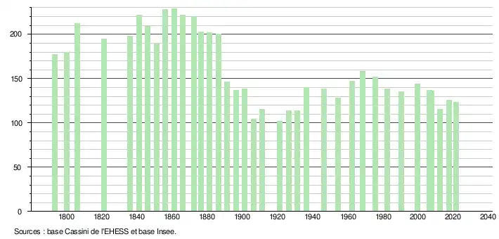 L'évolution du nombre d'habitants est connue à travers les recensements de la population effectués dans la commune depuis 1793. Pour les communes de moins de 10 000 habitants, une enquête de recensement portant sur toute la population est réalisée tous les cinq ans, les populations légales des années intermédiaires étant quant à elles estimées par interpolation ou extrapolation[18]. Pour la commune, le premier recensement exhaustif entrant dans le cadre du nouveau dispositif a été réalisé en 2007[19].