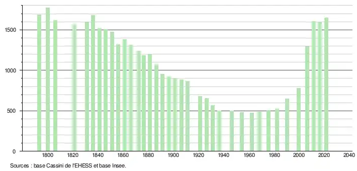 L'évolution du nombre d'habitants est connue à travers les recensements de la population effectués dans la commune depuis 1793. Pour les communes de moins de 10 000 habitants, une enquête de recensement portant sur toute la population est réalisée tous les cinq ans, les populations légales des années intermédiaires étant quant à elles estimées par interpolation ou extrapolation[31]. Pour la commune, le premier recensement exhaustif entrant dans le cadre du nouveau dispositif a été réalisé en 2006[32].