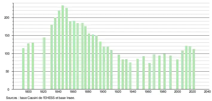L'évolution du nombre d'habitants est connue à travers les recensements de la population effectués dans la commune depuis 1793. Pour les communes de moins de 10 000 habitants, une enquête de recensement portant sur toute la population est réalisée tous les cinq ans, les populations légales des années intermédiaires étant quant à elles estimées par interpolation ou extrapolation[23]. Pour la commune, le premier recensement exhaustif entrant dans le cadre du nouveau dispositif a été réalisé en 2006[24].