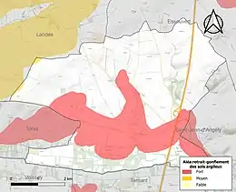 Le retrait-gonflement des sols argileux est susceptible d'engendrer des dommages importants aux bâtiments en cas d’alternance de périodes de sécheresse et de pluie. 27,3 % de la superficie communale est en aléa moyen ou fort (54,2 % au niveau départemental et 48,5 % au niveau national). Sur les 323 bâtiments dénombrés sur la commune en 2019, 296 sont en aléa moyen ou fort, soit 92 %, à comparer aux 57 % au niveau départemental et 54 % au niveau national. Une cartographie de l'exposition du territoire national au retrait gonflement des sols argileux est disponible sur le site du BRGM[13],[Carte 2].