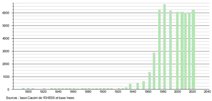 L'évolution du nombre d'habitants est connue à travers les recensements de la population effectués dans la commune depuis 1793. Pour les communes de moins de 10 000 habitants, une enquête de recensement portant sur toute la population est réalisée tous les cinq ans, les populations légales des années intermédiaires étant quant à elles estimées par interpolation ou extrapolation[50]. Pour la commune, le premier recensement exhaustif entrant dans le cadre du nouveau dispositif a été réalisé en 2005[51].