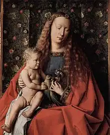La Vierge est vêtue d'une robe bleue et d'un somptueux manteau rouge. Elle est assise sur un trône situé sur une estrade, devant un baldaquin de brocard orné de roses, symbole d'amour, de lys, symbole de pureté, et de narcisses, symbole de renouveau[12]. La scène se situant à l'intérieur d'une église, la Vierge se trouve à l'emplacement de l'autel. Le sol et l'estrade du trône sont recouverts d'un tapis oriental[11]. Les accoudoirs du trône sont ornés de sculptures représentant à gauche Adam et Caïn tuant Abel et à droite Ève et Samson tuant le lion[13]. Le visage idéalisé de Marie est très similaire à celui de la Vierge de l'Annonciation de van Eyck conservée à Washington[14].