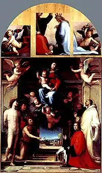 L'œuvre était autrefois surmontée d'une lunette représentant le couronnement de la Vierge par le Christ peinte par Mariotto Albertinelli, peintre qui travailla souvent en collaboration avec Fra Bartolomeo. Il subsiste, de cet élément, trois fragments présentés à la Staatsgalerie de Stuttgart.
