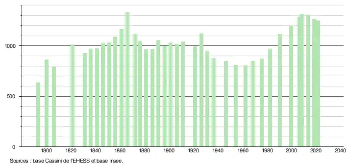 L'évolution du nombre d'habitants est connue à travers les recensements de la population effectués dans la commune depuis 1793. Pour les communes de moins de 10 000 habitants, une enquête de recensement portant sur toute la population est réalisée tous les cinq ans, les populations légales des années intermédiaires étant quant à elles estimées par interpolation ou extrapolation[50]. Pour la commune, le premier recensement exhaustif entrant dans le cadre du nouveau dispositif a été réalisé en 2008[51].