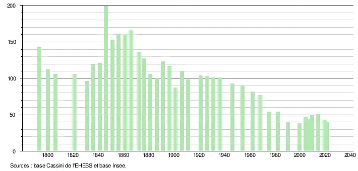 L'évolution du nombre d'habitants est connue à travers les recensements de la population effectués dans la commune depuis 1793. Pour les communes de moins de 10 000 habitants, une enquête de recensement portant sur toute la population est réalisée tous les cinq ans, les populations légales des années intermédiaires étant quant à elles estimées par interpolation ou extrapolation[17]. Pour la commune, le premier recensement exhaustif entrant dans le cadre du nouveau dispositif a été réalisé en 2004[18].
