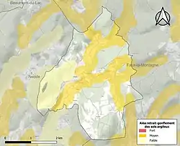 Le retrait-gonflement des sols argileux est susceptible d'engendrer des dommages importants aux bâtiments en cas d’alternance de périodes de sécheresse et de pluie. 35,1 % de la superficie communale est en aléa moyen ou fort (33,6 % au niveau départemental et 48,5 % au niveau national). Sur les 55 bâtiments dénombrés sur la commune en 2019, 18 sont en aléa moyen ou fort, soit 33 %, à comparer aux 25 % au niveau départemental et 54 % au niveau national. Une cartographie de l'exposition du territoire national au retrait gonflement des sols argileux est disponible sur le site du BRGM[17],[Carte 2].