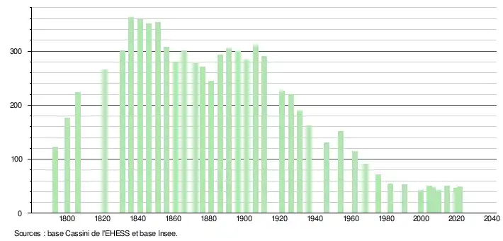 L'évolution du nombre d'habitants est connue à travers les recensements de la population effectués dans la commune depuis 1793. Pour les communes de moins de 10 000 habitants, une enquête de recensement portant sur toute la population est réalisée tous les cinq ans, les populations légales des années intermédiaires étant quant à elles estimées par interpolation ou extrapolation[23]. Pour la commune, le premier recensement exhaustif entrant dans le cadre du nouveau dispositif a été réalisé en 2004[24].