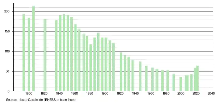 L'évolution du nombre d'habitants est connue à travers les recensements de la population effectués dans la commune depuis 1793. Pour les communes de moins de 10 000 habitants, une enquête de recensement portant sur toute la population est réalisée tous les cinq ans, les populations légales des années intermédiaires étant quant à elles estimées par interpolation ou extrapolation[20]. Pour la commune, le premier recensement exhaustif entrant dans le cadre du nouveau dispositif a été réalisé en 2008[21].