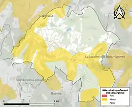 Le retrait-gonflement des sols argileux est susceptible d'engendrer des dommages importants aux bâtiments en cas d’alternance de périodes de sécheresse et de pluie. 44,9 % de la superficie communale est en aléa moyen ou fort (33,6 % au niveau départemental et 48,5 % au niveau national). Sur les 78 bâtiments dénombrés sur la commune en 2019, 16 sont en aléa moyen ou fort, soit 21 %, à comparer aux 25 % au niveau départemental et 54 % au niveau national. Une cartographie de l'exposition du territoire national au retrait gonflement des sols argileux est disponible sur le site du BRGM[16],[Carte 2].