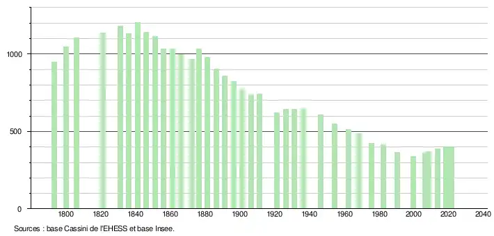 | L'évolution du nombre d'habitants est connue à travers les recensements de la population effectués dans la commune depuis 1793. Pour les communes de moins de 10 000 habitants, une enquête de recensement portant sur toute la population est réalisée tous les cinq ans, les populations légales des années intermédiaires étant quant à elles estimées par interpolation ou extrapolation[32]. Pour la commune, le premier recensement exhaustif entrant dans le cadre du nouveau dispositif a été réalisé en 2008[33]. En 2021, la commune comptait 400 habitants[Note 6], en augmentation de 4,44 % par rapport à 2015 (Tarn-et-Garonne : +3,17 %, France hors Mayotte : +1,84 %). |