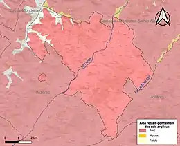 Le retrait-gonflement des sols argileux est susceptible d'engendrer des dommages importants aux bâtiments en cas d’alternance de périodes de sécheresse et de pluie. 95,6 % de la superficie communale est en aléa moyen ou fort (92 % au niveau départemental et 48,5 % au niveau national). Sur les 214 bâtiments dénombrés sur la commune en 2019, 202 sont en aléa moyen ou fort, soit 94 %, à comparer aux 96 % au niveau départemental et 54 % au niveau national. Une cartographie de l'exposition du territoire national au retrait gonflement des sols argileux est disponible sur le site du BRGM[26],[Carte 3].