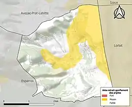 Le retrait-gonflement des sols argileux est susceptible d'engendrer des dommages importants aux bâtiments en cas d’alternance de périodes de sécheresse et de pluie. 31,5 % de la superficie communale est en aléa moyen ou fort (44,5 % au niveau départemental et 48,5 % au niveau national). Sur les 88 bâtiments dénombrés sur la commune en 2019, 51 sont en aléa moyen ou fort, soit 58 %, à comparer aux 75 % au niveau départemental et 54 % au niveau national. Une cartographie de l'exposition du territoire national au retrait gonflement des sols argileux est disponible sur le site du BRGM[31],[Carte 3].