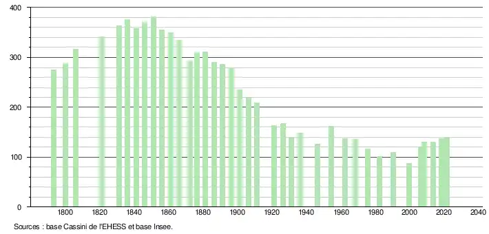 L'évolution du nombre d'habitants est connue à travers les recensements de la population effectués dans la commune depuis 1793. Pour les communes de moins de 10 000 habitants, une enquête de recensement portant sur toute la population est réalisée tous les cinq ans, les populations légales des années intermédiaires étant quant à elles estimées par interpolation ou extrapolation[15]. Pour la commune, le premier recensement exhaustif entrant dans le cadre du nouveau dispositif a été réalisé en 2008[16].