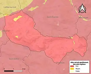 Le retrait-gonflement des sols argileux est susceptible d'engendrer des dommages importants aux bâtiments en cas d’alternance de périodes de sécheresse et de pluie[19]. La totalité de la commune est en aléa moyen ou fort (91,8 % au niveau départemental et 48,5 % au niveau national)[Carte 2]. Depuis le , en application de la loi ELAN, différentes contraintes s'imposent aux vendeurs, maîtres d'ouvrages ou constructeurs de biens situés dans une zone classée en aléa moyen ou fort[Note 4],[20].