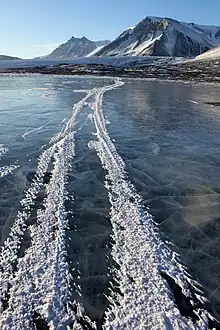 Vue de la surface du lac Fryxell avec le glacier Canada et la chaîne Transantarctique en arrière-plan. | ||