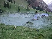 - phase nocturne : la couche d'air près du sol sur les pentes se refroidit radiativement, descend et s'accumule dans des cuvettes[3]. Ici, l'air froid, plus dense que l'air environnant, reste bloqué sous la couche d'inversion ;
