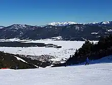 La lac de Matemale en hiver. En bas : Les Angles. Au fond : le massif du Canigou.