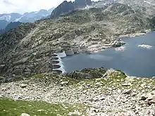 Lac de Migouélou en été depuis le col d'Artouste. En fond, derrière le barrage, le pic Arrouy. | |||