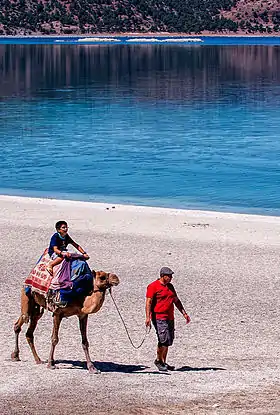 Touriste à dos de chameau au lac de Salda