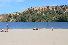Une partie de la réserve est isolée du reste du lac par une digue supportant le passage de la route nationale 116, et permettant la baignade sécurisée, depuis la plage des Escoumes.