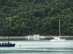 La navigation est interdite sur le lac à partir de 1,4 km en amont du barrage, cette zone est signalisée par des panneaux et des bouées interdisant la navigation et est également pré-signalisée à 600 m en amont de la zone interdite[15]. En 1997, cette zone d'interdiction de navigation était située à 200 m en amont du barrage[16].