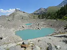 Le lac du Miage en 2010 ; en arrière-plan, l'aiguille Noire de Peuterey. | ||