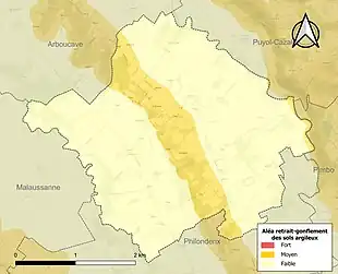 Le retrait-gonflement des sols argileux est susceptible d'engendrer des dommages importants aux bâtiments en cas d’alternance de périodes de sécheresse et de pluie. 18,5 % de la superficie communale est en aléa moyen ou fort (19,2 % au niveau départemental et 48,5 % au niveau national). Sur les 77 bâtiments dénombrés sur la commune en 2019, 27 sont en aléa moyen ou fort, soit 35 %, à comparer aux 17 % au niveau départemental et 54 % au niveau national. Une cartographie de l'exposition du territoire national au retrait gonflement des sols argileux est disponible sur le site du BRGM[20],[Carte 2].