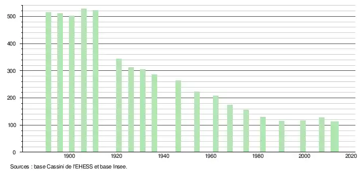 L'évolution du nombre d'habitants est connue à travers les recensements de la population effectués dans la commune depuis 1891. À partir du , les populations légales des communes sont publiées annuellement dans le cadre d'un recensement qui repose désormais sur une collecte d'information annuelle, concernant successivement tous les territoires communaux au cours d'une période de cinq ans. Pour les communes de moins de 10 000 habitants, une enquête de recensement portant sur toute la population est réalisée tous les cinq ans, les populations légales des années intermédiaires étant quant à elles estimées par interpolation ou extrapolation[7]. Pour la commune, le premier recensement exhaustif entrant dans le cadre du nouveau dispositif a été réalisé en 2007[8],[Note 1].
