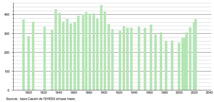 L'évolution du nombre d'habitants est connue à travers les recensements de la population effectués dans la commune depuis 1793. Pour les communes de moins de 10 000 habitants, une enquête de recensement portant sur toute la population est réalisée tous les cinq ans, les populations légales des années intermédiaires étant quant à elles estimées par interpolation ou extrapolation[14]. Pour la commune, le premier recensement exhaustif entrant dans le cadre du nouveau dispositif a été réalisé en 2004[15].