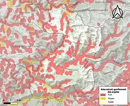 La commune est vulnérable au risque de mouvements de terrains constitué principalement du retrait-gonflement des sols argileux[34]. Cet aléa est susceptible d'engendrer des dommages importants aux bâtiments en cas d’alternance de périodes de sécheresse et de pluie. 32 % de la superficie communale est en aléa moyen ou fort (76,3 % au niveau départemental et 48,5 % au niveau national). Sur les 357 bâtiments dénombrés sur la commune en 2019, 233 sont en aléa moyen ou fort, soit 65 %, à comparer aux 90 % au niveau départemental et 54 % au niveau national. Une cartographie de l'exposition du territoire national au retrait gonflement des sols argileux est disponible sur le site du BRGM[35],[Carte 3].