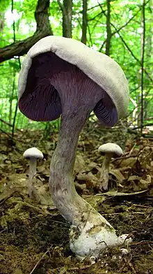 Les lames sont adnées, larges, épaisses, espacées, violettes ou pourpres.