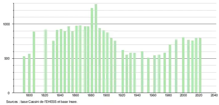 L'évolution du nombre d'habitants est connue à travers les recensements de la population effectués dans la commune depuis 1793. Pour les communes de moins de 10 000 habitants, une enquête de recensement portant sur toute la population est réalisée tous les cinq ans, les populations légales des années intermédiaires étant quant à elles estimées par interpolation ou extrapolation[32]. Pour la commune, le premier recensement exhaustif entrant dans le cadre du nouveau dispositif a été réalisé en 2006[33].