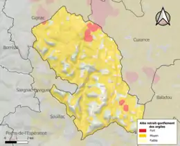 Le retrait-gonflement des sols argileux est susceptible d'engendrer des dommages importants aux bâtiments en cas d’alternance de périodes de sécheresse et de pluie. 74,9 % de la superficie communale est en aléa moyen ou fort (67,7 % au niveau départemental et 48,5 % au niveau national). Sur les 569 bâtiments dénombrés sur la commune en 2019, 428 sont en aléa moyen ou fort, soit 75 %, à comparer aux 72 % au niveau départemental et 54 % au niveau national. Une cartographie de l'exposition du territoire national au retrait gonflement des sols argileux est disponible sur le site du BRGM[28],[Carte 2].