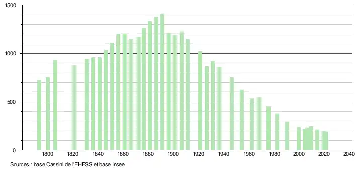 L'évolution du nombre d'habitants est connue à travers les recensements de la population effectués dans la commune depuis 1793. Pour les communes de moins de 10 000 habitants, une enquête de recensement portant sur toute la population est réalisée tous les cinq ans, les populations légales des années intermédiaires étant quant à elles estimées par interpolation ou extrapolation[27]. Pour la commune, le premier recensement exhaustif entrant dans le cadre du nouveau dispositif a été réalisé en 2004[28].