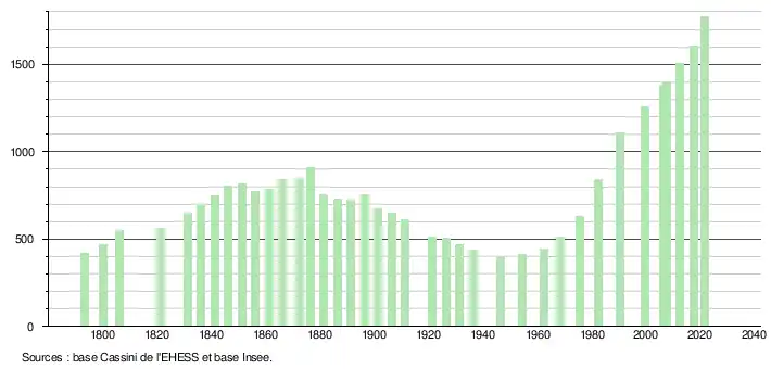 L'évolution du nombre d'habitants est connue à travers les recensements de la population effectués dans la commune depuis 1793. Pour les communes de moins de 10 000 habitants, une enquête de recensement portant sur toute la population est réalisée tous les cinq ans, les populations légales des années intermédiaires étant quant à elles estimées par interpolation ou extrapolation[21]. Pour la commune, le premier recensement exhaustif entrant dans le cadre du nouveau dispositif a été réalisé en 2007[22].