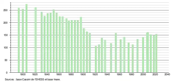 L'évolution du nombre d'habitants est connue à travers les recensements de la population effectués dans la commune depuis 1793. Pour les communes de moins de 10 000 habitants, une enquête de recensement portant sur toute la population est réalisée tous les cinq ans, les populations légales des années intermédiaires étant quant à elles estimées par interpolation ou extrapolation[26]. Pour la commune, le premier recensement exhaustif entrant dans le cadre du nouveau dispositif a été réalisé en 2007[27].