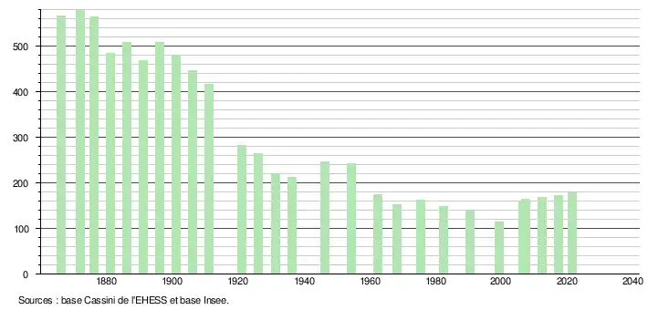 | L'évolution du nombre d'habitants est connue à travers les recensements de la population effectués dans la commune depuis 1866. Pour les communes de moins de 10 000 habitants, une enquête de recensement portant sur toute la population est réalisée tous les cinq ans, les populations légales des années intermédiaires étant quant à elles estimées par interpolation ou extrapolation[25]. Pour la commune, le premier recensement exhaustif entrant dans le cadre du nouveau dispositif a été réalisé en 2007[26]. En 2021, la commune comptait 179 habitants[Note 6], en augmentation de 7,19 % par rapport à 2015 (Aude : +2,47 %, France hors Mayotte : +1,84 %). |
