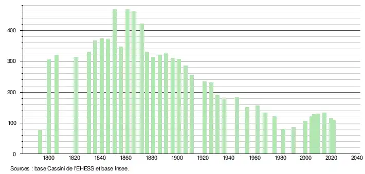 L'évolution du nombre d'habitants est connue à travers les recensements de la population effectués dans la commune depuis 1793. Pour les communes de moins de 10 000 habitants, une enquête de recensement portant sur toute la population est réalisée tous les cinq ans, les populations légales des années intermédiaires étant quant à elles estimées par interpolation ou extrapolation[17]. Pour la commune, le premier recensement exhaustif entrant dans le cadre du nouveau dispositif a été réalisé en 2004[18].
