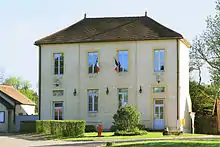 - Le château d'Arcenay date aussi du XIVe siècle, il a également été reconstruit au XVIIIe siècle par l'architecte Jean-Baptiste Caristie[27]. Il est composé d'un corps principal flanqué de deux ailes, selon un plan en H, le tout couvert de hauts toits à lucarnes. Les dépendances sont constituées d'une grange et d'un pigeonnier, en partie détruit, qui a gardé ses boulins. Le parc est inscrit M.H. depuis le 29 mai 2020[28].